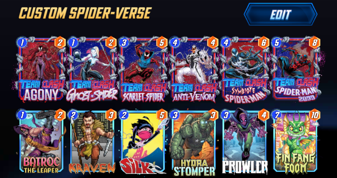 Spider-Verse was one of the big disappointments of the last run and a lot of that was due to how bad the Anti-Venom design felt. The new one adds to rather than inhibits your strategy and getting some extra Energy to play with, like the X-Men, while dodging and bobbing and weaving has been fun. Brotherhood on the other hand... just may be the worst team... which always gets my creative juices flowing. Here are my favorite lists for each team so far.