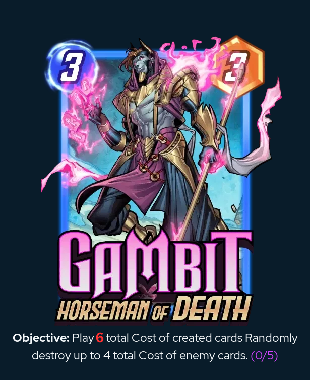 Gambit, Horseman of Death received a nerf in the OTA yesterday. Loyal readers will know I’ve been anticipating an inevitable nerf for this card and exploring different proposals. Gambit’s objective changed from having to play 5-Cost worth of created cards to now needing 6-Cost. It’s not an insignificant change. Getting to 5 was pretty trivial and you could cobble your way there with some Demons, Mirage cards, and perhaps a Frigga card. However, both before the change and after, a Valentina card alone gets you there. Occasionally an Iron Patriot card will be able to fulfil the Objective on its own. Before the release of this card, when theory-crafting and building decks, the Valentina interaction stuck out to me as problematic. If an Objective is supposed to be like a little mini-quest that gets you some desirable outcome, Valentina cuts that quest down to a mere moment. I’m not opposed to keeping this interaction – it’s cool for Valentina to have a new role and partner in villainy. However, I think Gambit is basically going to be as problematic as he was before, laying waste to entire boards of opposing low-cost cards in a way that really stifles creativity and the viability of a variety of decks. They could have increased Gambit’s cost, therefore making him much more difficult to copy, changed his targeting in some way, or changed how he counts discounted created cards. You don't necessarily have to decouple Valentina and Gambit, but that's one solution. I think it’s very likely that this card will need to be revisited down the road and it may be treated too harshly when that time comes. I would have much preferred a more permanent first solution that gets to the core issue more effectively.
