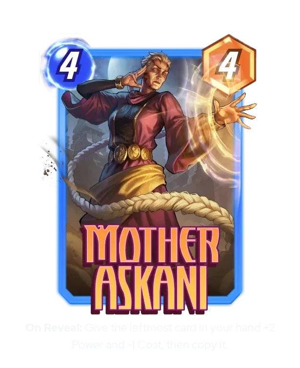 Why I'm excited: Not exactly the way I wanted Rachel Summers, a favorite character of mine, added to the game. But the discount + buff and then copy is such a fun mechanic that I think I'm going to find a bunch of fun ways to use this card. The obvious home is Victoria Hand, but just as deck-brewers have always found quirky uses for Moon Girl, so will they for Mother Askani.