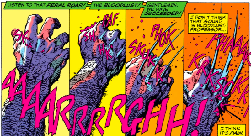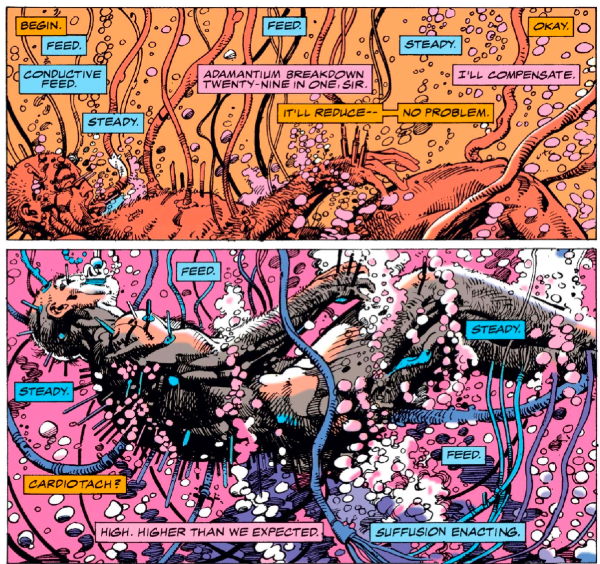 The storyline really kicks off in issue #73, as we see some government goons abduct Logan. He’s placed in a vat of mysterious liquid and has adamantium pumped into his system while a series of almost hypnotic chant-like scientific instructions surround the images in narration boxes.