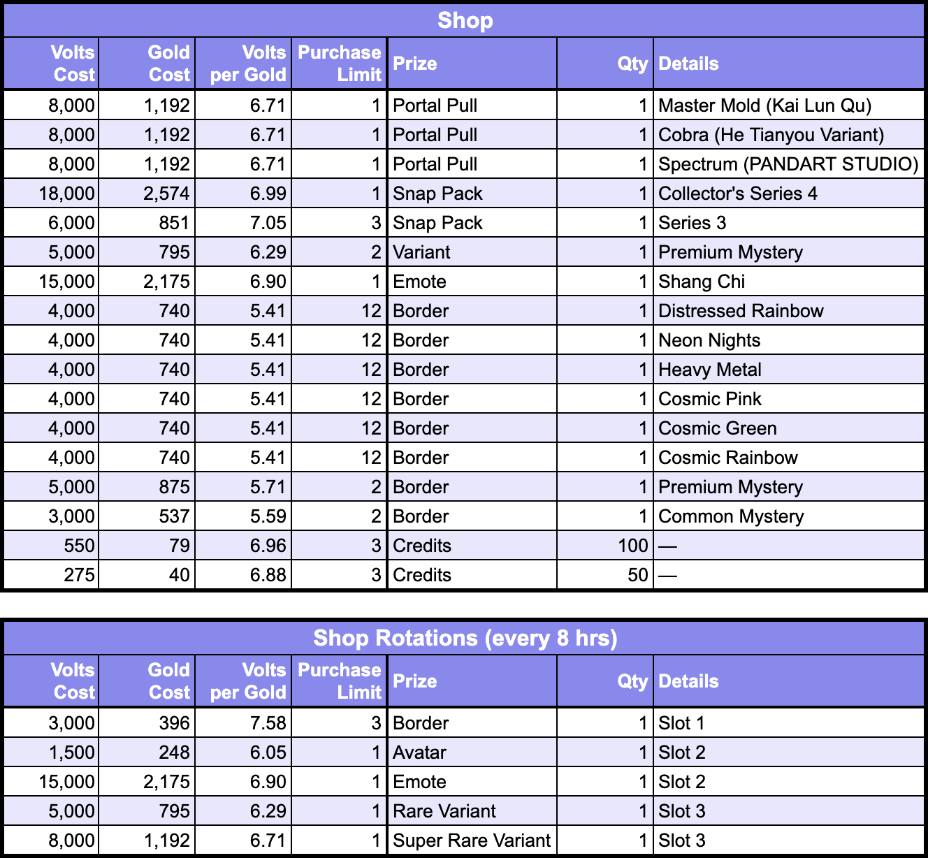 If you're short on Volts, you can spend Gold to cover the gap. It's not the best use of Gold, but if you're going to do it, make sure to prioritize which items to buy with Gold. Each item offers a different amount of Volts per Gold spent. Note I have changed this calculation versus past guides to make it more intuitive. Higher Volts per Gold means you're getting a better deal.