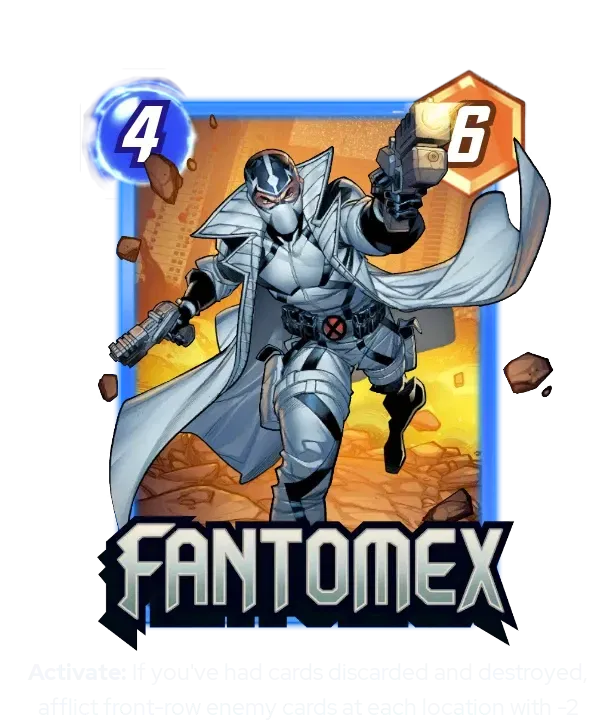 Let's take a look at what Fantomex's power output is. He has 6-Power himself, which isn't awful for a 4-Cost card, and 4/7 would probably be too outrageous given he has powerful potential upside. If you are able to fulfill his condition AND your opponent has the front row of all three locations occupied, Fantomex will afflict -12, making him essentially a 4/18. That second clause is important. Your opponent often will not have all of their front rows occupied meaning 4/16 or 4/14 are much more likely. I'd peg his range at around 12-18 power, though you could get him up to 30 with a cheeky Jocasta.