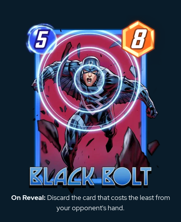The best thing I've done with Black Bolt lately is leave him in my hand for Stryfe to copy since spending 5-Energy on this effect doesn't feel at all worth it. The only way I see this type of strategy surviving in the current world of Marvel Snap is if you can strip your opponent's hand of multiple cards. For disruption, you're far better off just playing a Supergiant deck, incidentally another deck that eats Black Bolt alive.
