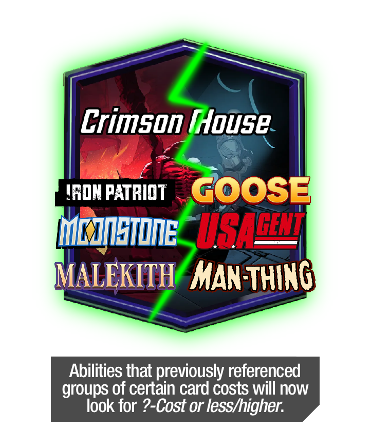 As an example, instead of saying "4, 5, and 6-Cost cards here have -3 Power." USAgent will say "Cards with 4 -Cost or higher here have -3 Power." Malekith will now say "Add a card with 3-Cost or less here, but don't reveal it until the game ends instead of "add a 1, 2, or 3-Cost card from your deck here, but don't reveal it until the game ends."