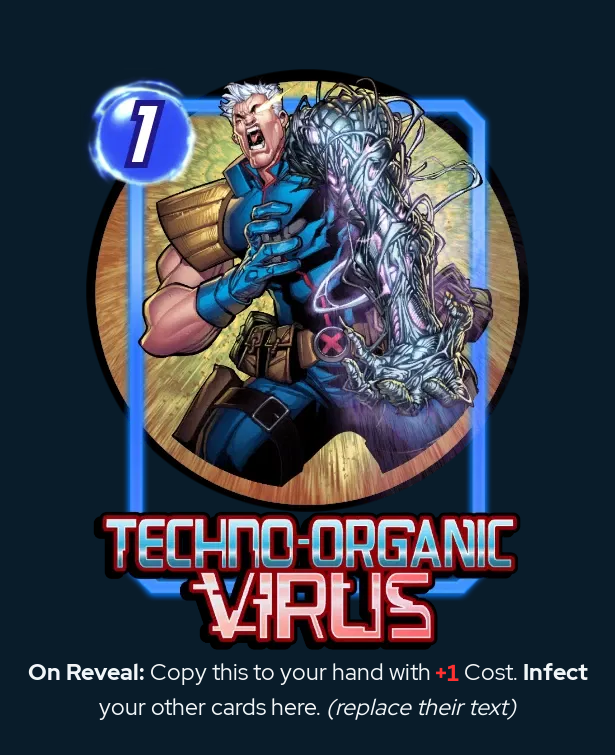 - [Old] 1 - On Reveal: Copy this to your hand with +2 Cost. Infect your other cards here. (replace their text)