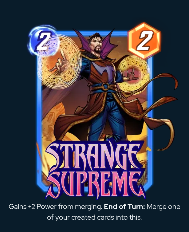 Once the most dominant card in the game, Strange has fallen on hard times. Victoria Hand just made boosting your created cards so much stronger than devouring them. The key card with Strange Supreme, in my opinion, is Cosmo.