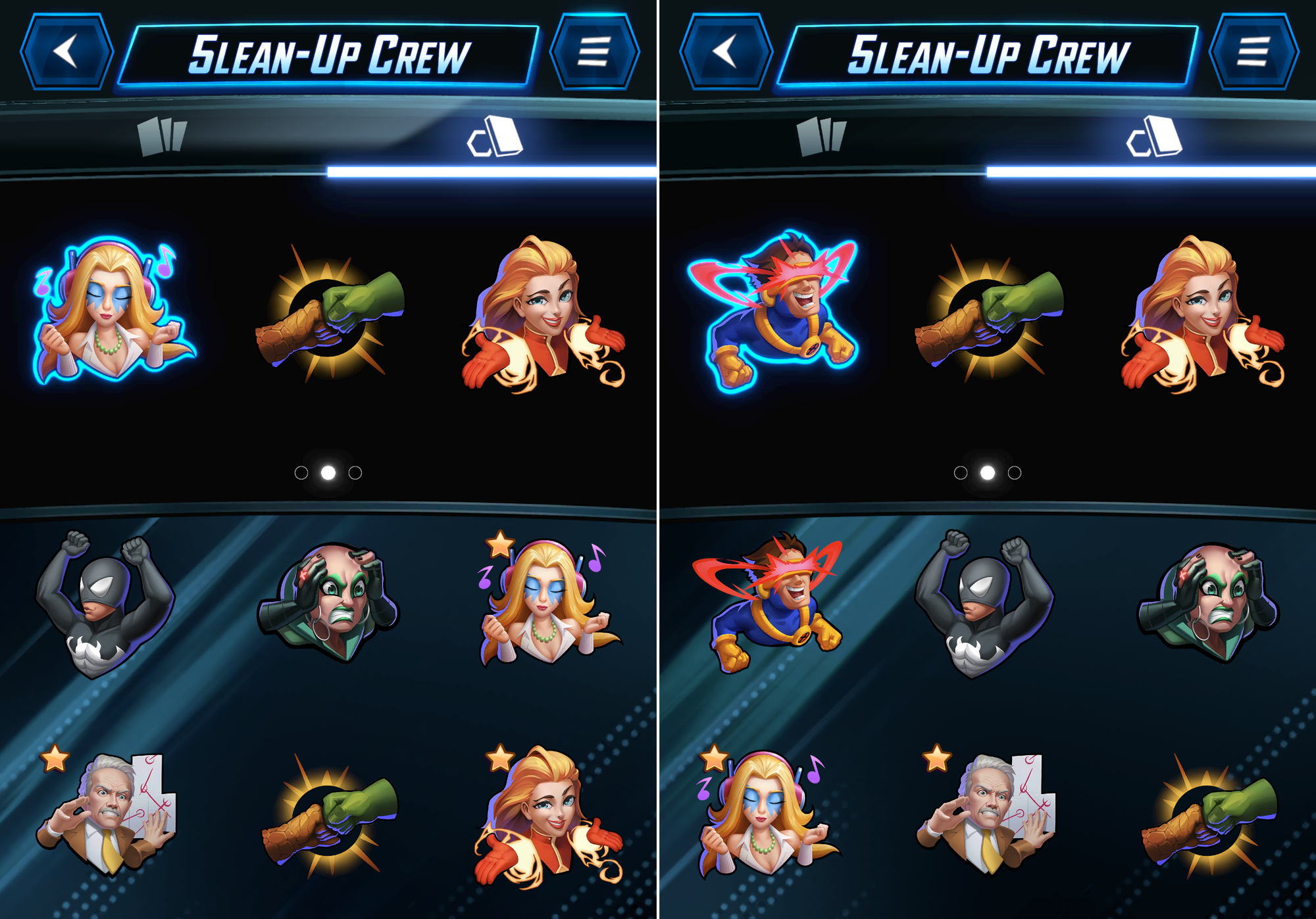 I equipped Cyclops, and he shot right up to the top of the list. This works whether you use "Equip to All" or "Equip". For the rest of this article, I'm going to call this screen the "Emote Collection".