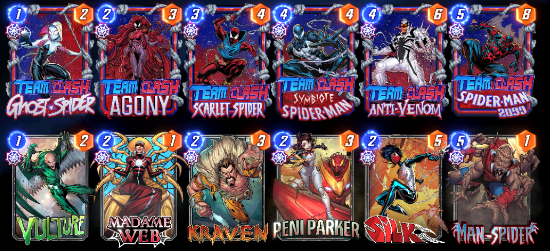 - Team Clash Agony: After you play a card here, merge this with it. If it's a Spider-Verse card, move it away from here.