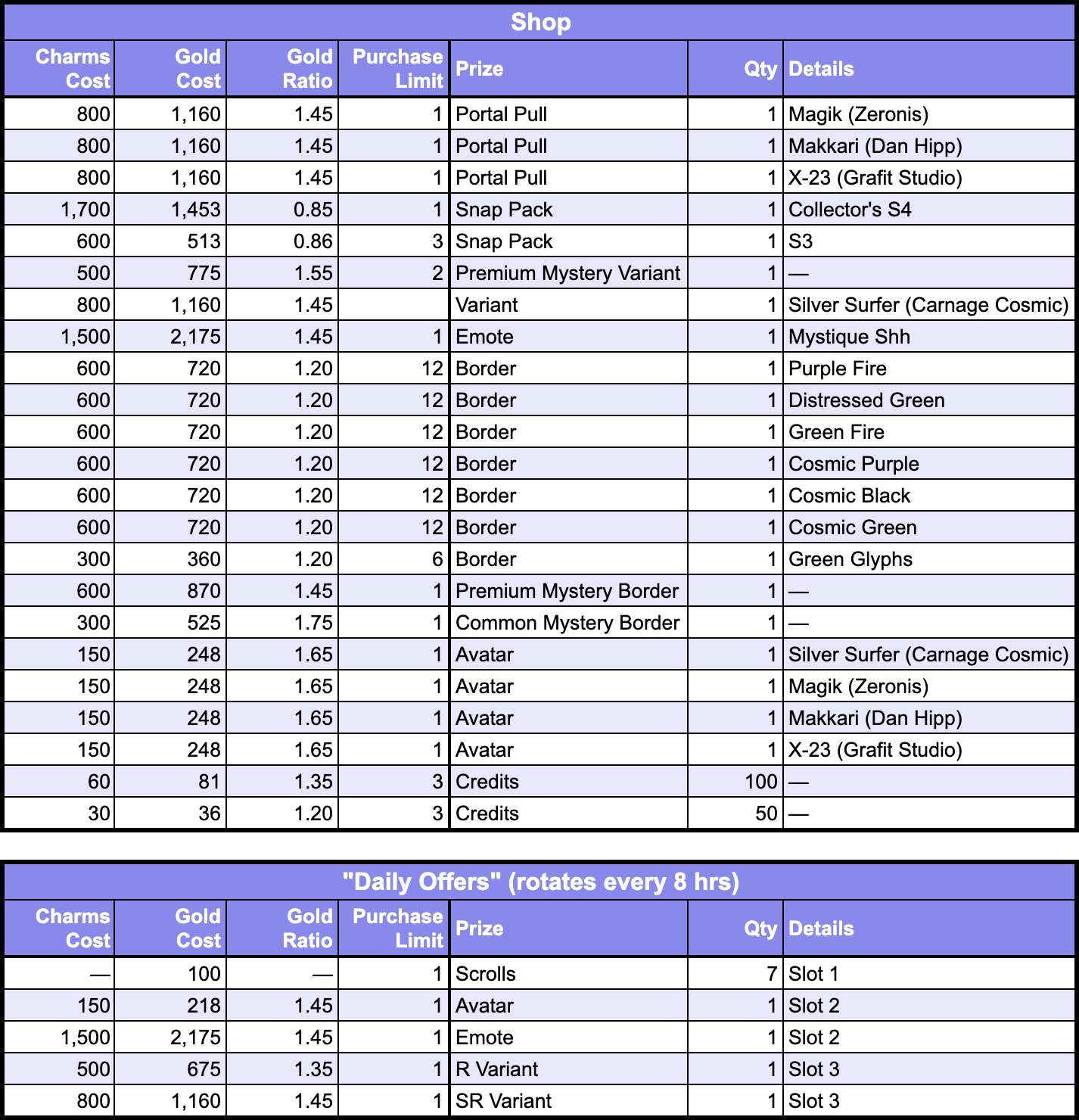 If you are going to spend Gold in the Shop, it's good to be strategic because every item has a different Gold:Charms conversion rate (lower "Gold Ratio" is better).