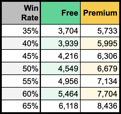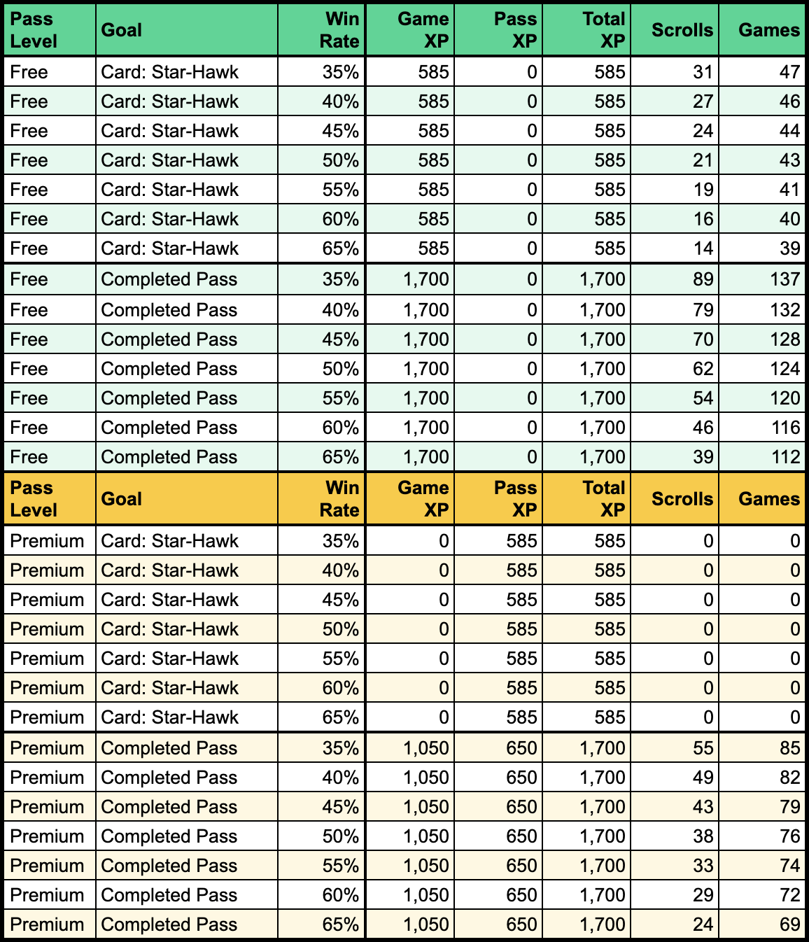 Even with the reduction in Scrolls, it's still totally doable to complete the Free Pass with a poor win rate and without spending any Gold. A player with a 35% win rate will need about 89 Scrolls to finish the Pass. You can get 100 for free.