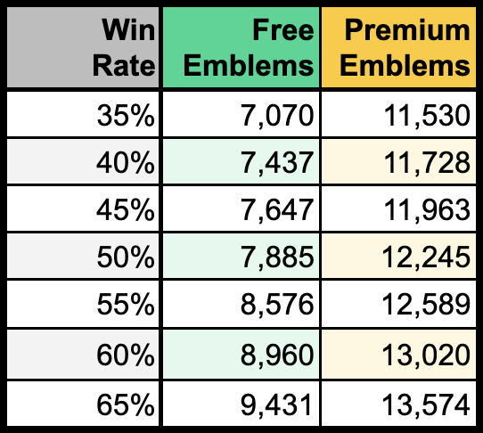 For those who like to plan out what they’re getting from the shop, here’s a table showing how many Emblems you’ll have to shop with. Again, we’re concerned with active play here – spending your Tickets on games and keeping up with your Missions.