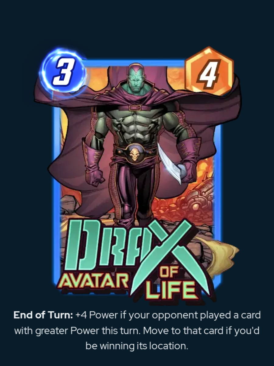 He's a reactive card, dependent on your opponent’s actions, so we don't expect a ton of internal synergy. However, he does have End of Turn text, so we can pair him with First Steps Invisible Woman. However, Drax will only keep growing if your opponent’s card is still bigger after the first boost. Fortunately, we're currently using him to counter really, really big cards like Fin Fang Foom, so this might mean there is something to putting Drax in End of Turn.
