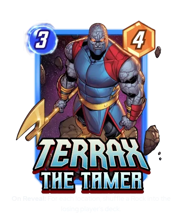 Debrii will be in almost every Ozymandias deck. An 8-Power body that also produces rocks is just insane. Honestly, she might be too good. If this archetype really does take off, it will be on the back of Debrii. Sandstorm is the other slam dunk. It puts rocks into your hand and the deck is likely to be able to have a solid front-row presence. I hope you picked this card up from Team Clash in anticipation of this archetype! Rhino has been less obviously powerful than Debrii, but 2/5 is a solid Cost/Power ratio and he helps fill your board early for Sandstorm. The card I'm less convinced of is Mole Man. He's a high-variance card with a below-rate body and and informational downside. Don't worry about the banish – it's the same as if the cards were on the bottom of your deck – but the information reveal and variance keep me from being enthusiastic about adding this card to my deck. If we really can't find a better 12th card or we end up with a build replete with high-cost cards, Mole Man could make the cut (if you're thinking about Howard, you've already lost). Terrax is clearly not a good idea, but it is a funny one!
